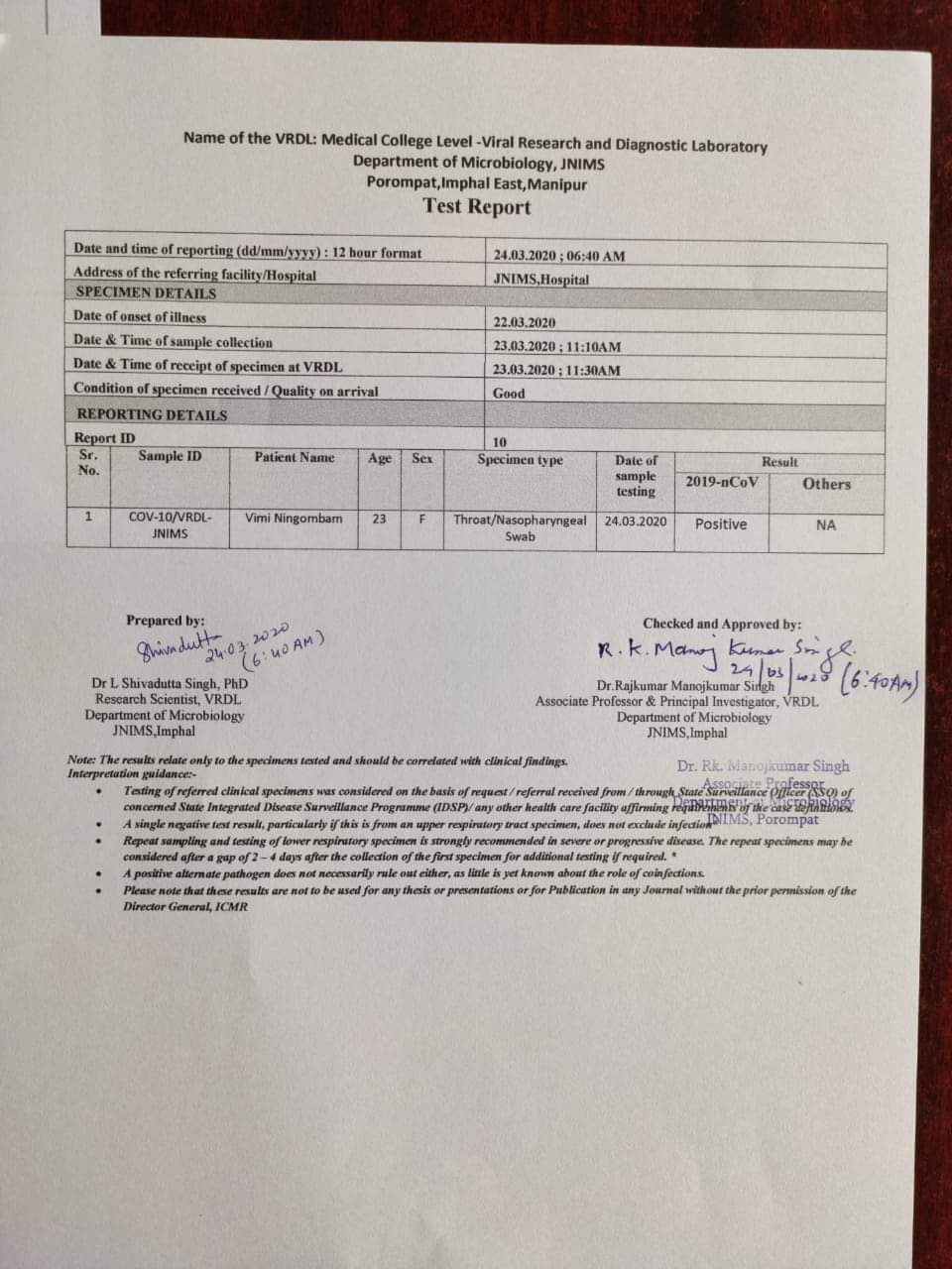 Manipur has reported the first case of COVID-19 in Northeast India, say reports. Northeast Now reports that a 23-year-old from Imphal (west) has been identified as the first confirmed case in the state.