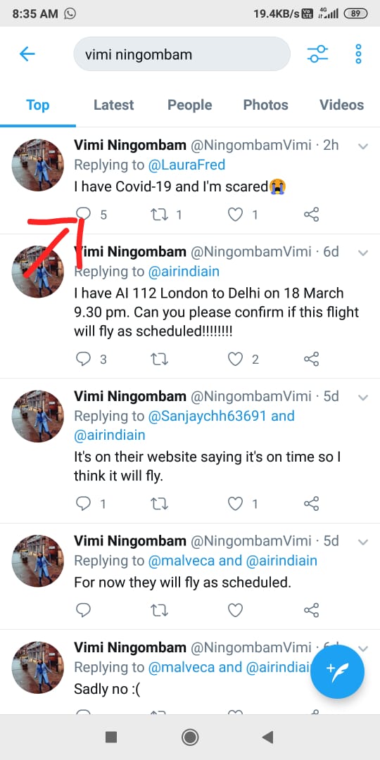 Ningombam Vimi (23) was found infected with the first coronavirus case in North East India, whose account has since been deleted, had tweeted about her being tested positive for the novel virus. In a series of tweets she was seen asking if her Air India flight to India was cancelled or not.